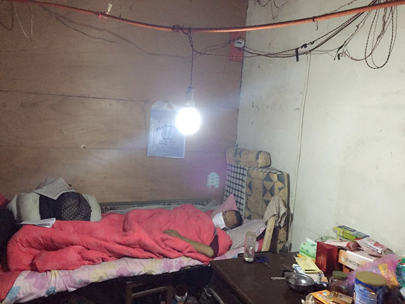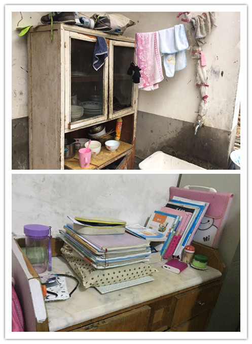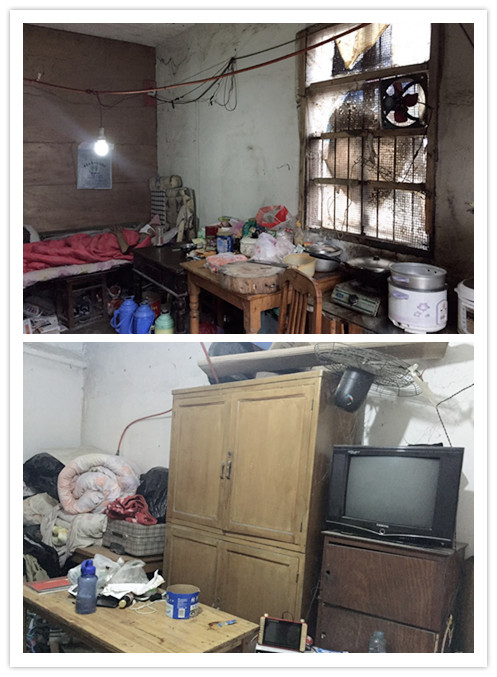 在合肥电视台的带领下,我们来到他的家中,那是一栋独立存在的二层小楼,与周围林立的高楼格格不入的是这里更加荒芜而凄落的景象。走进客厅,简陋斑驳,因为烧饭、吃饭、睡觉等都在一间房间里,所以房子显得更加狭窄。整个房间阴暗、潮湿,生活设施十分简陋。