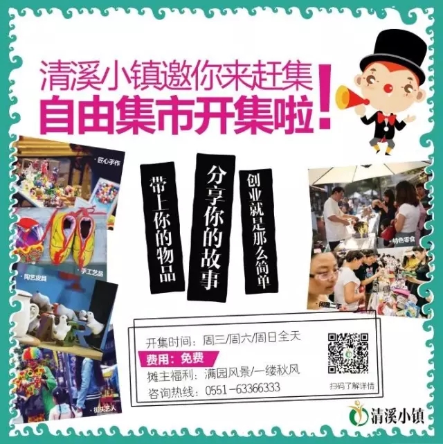 最新潮,最时尚的易物集市, 出售或交换个人收藏/手工物品/ 甚至可以出卖“自己” (ps:化妆/绘画/演唱/手工艺) 我们有场地、有大众, 你可以带上你的物品,分享你的故事, 我们需要更多的人加入 招募类型:包含复古物件儿/手作工艺/潮流文化美食体验/街头艺人/闲置二手等等。 走在风景优美的清溪小镇,快乐的逛着市集, 听着音乐,赏着花,逗着鱼, 聊着我们想聊的话题, 这在合肥虽然不是第一次 但一定是最特别的一次 清溪小镇自由集市 招募中 我们需要你一起来加入一起来实现这个事情 因为你也怀揣梦想,我们必须要你加入 请将此消息转发并推荐给你身边的好朋友 招募时间:即日起—11月31日,招完为止 报名电话:0551-63366333